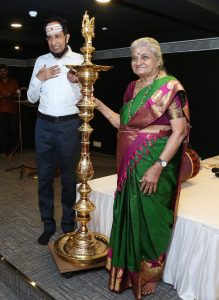 The secretary of above sabha is presenting a lamp to Smt. S. Rugmini