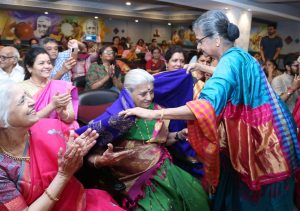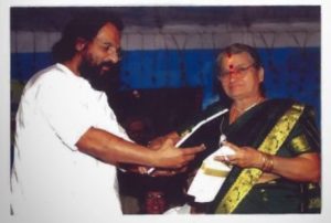 Smt. Rugmini teacher was appointed as the leading artist from Kerala in an event that was held at Bangalore in connection with the silver jubilee celebration of Art of Living by Sri. Sri. Ravishankar. Nearly 3800 artists had performed in this event. Similarly, in 2006, Smt. Rugmini presided over a symphony of around 250 vainikas at the “Punar Nava” silver jubilee celebration held at the Jawaharlal Nehru Stadium, Ernakulam from 28th Nov to 1st December, and was honoured with a ponnada by Sri. Sri. Ravi Shankar.