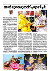 Smt. Rugmini teacher performed the first Veena concert at the beginning of the Thiruvananthapuram Doordarshan. She has been performing “Ragam tanam Pallavi”, national programmes as well as many veena concerts at Akashavani Thiruvananthapuram for 70 years. She performed National programmes at Doordarshan kendra Trivandrum and Chennai.