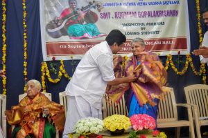 Sri. Rugmini Gopalakrishnan used to practice 18 hours a day. She has won the competition conducted by Akashvani and received award from India’s first President Sri. Rajendra Prasad in the year 1954. She had the opportunity to study under the guidance of Padmabhooshan Sri. K.S Narayana Swami Iyer for higher education as first scholarship student in 1954. This scholarship competition was held at Chennai and she went with Sri. Shemmangudi Sreenivasa Iyer to attend the same.